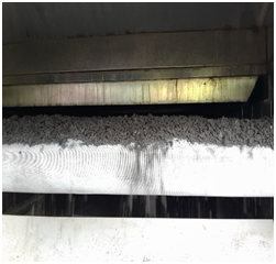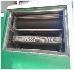 Step2: 污泥经粉碎模块粉碎处理后,大块污泥变为细小松散污泥,在重力作用下均匀平铺在网带输送模块的网状输送带上,网状输送带可根据需求设置若干层输送带;