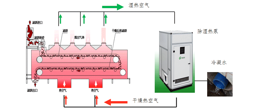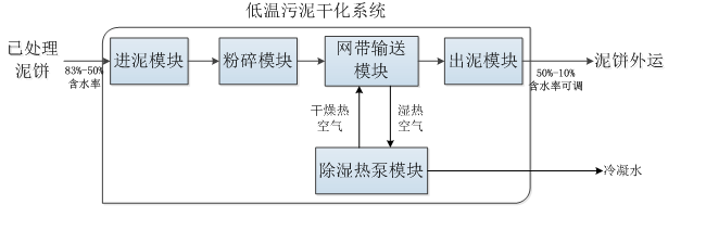 Step4: 除湿热泵模块将干燥热空气输送到网带输送模块中,干燥热空气流经污泥时带走污泥中的部分水分后变为湿热空气。湿热空气在气流作用下回到除湿热泵,湿热空气中的水分经过除湿热泵处理后以冷凝水的形式收集外排,湿热空气则变为干燥空气,经回热器加热后成为干燥热空气再次被送入到网带输送模块中循环除湿干燥工作;