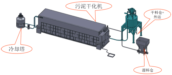 污泥干化系统需放置在平整地面运行,整套系统包括污泥干化机、湿料仓、干料仓、输送装置、冷却塔及控制电柜。